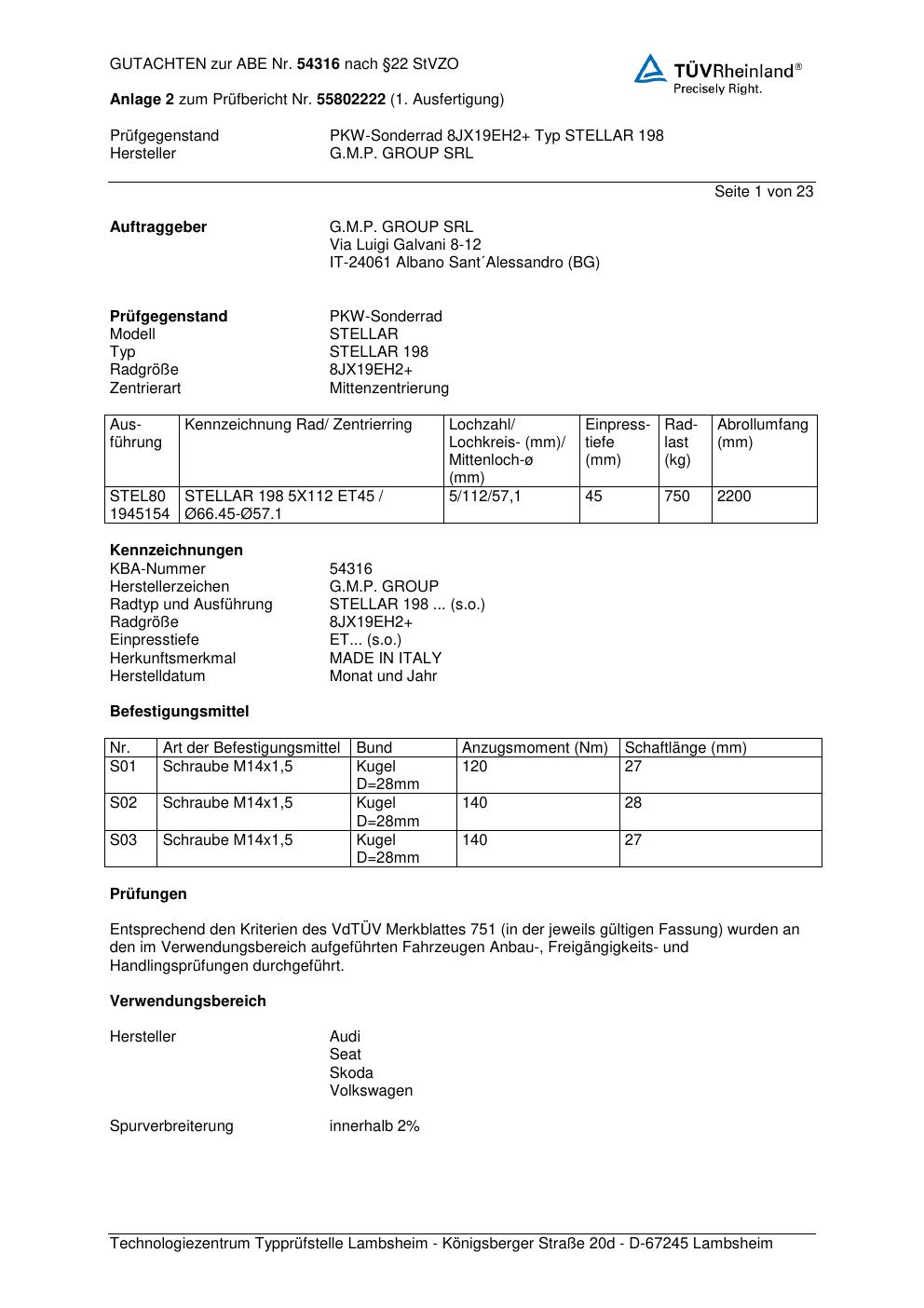 Dieses Gutachten (abe) bezieht sich auf die Alufelge G.M.P. GROUP SRL STELLAR 198 in der Ausführung ET 0, Mittenloch 0 mm (KBA 54316). Im PDF findest du typischerweise zulässige Reifengrößen, Auflagen/Anbauhinweise und – je nach Dokument – Hinweise zur Eintragung.