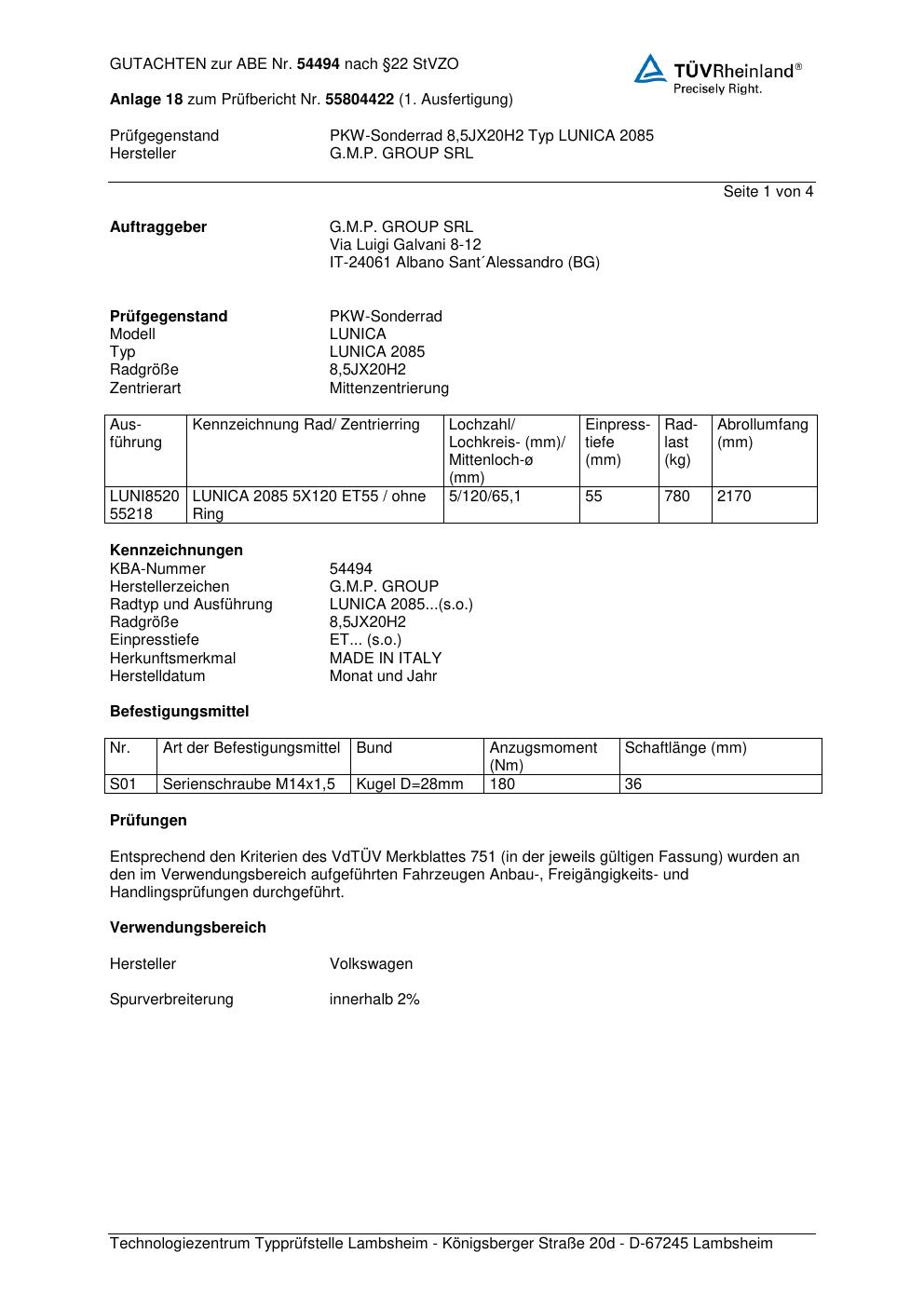 Dieses Gutachten (abe) bezieht sich auf die Alufelge G.M.P. GROUP SRL LUNICA 2 085 in der Ausführung ET 0, Mittenloch 0 mm (KBA 54494). Im PDF findest du typischerweise zulässige Reifengrößen, Auflagen/Anbauhinweise und – je nach Dokument – Hinweise zur Eintragung.