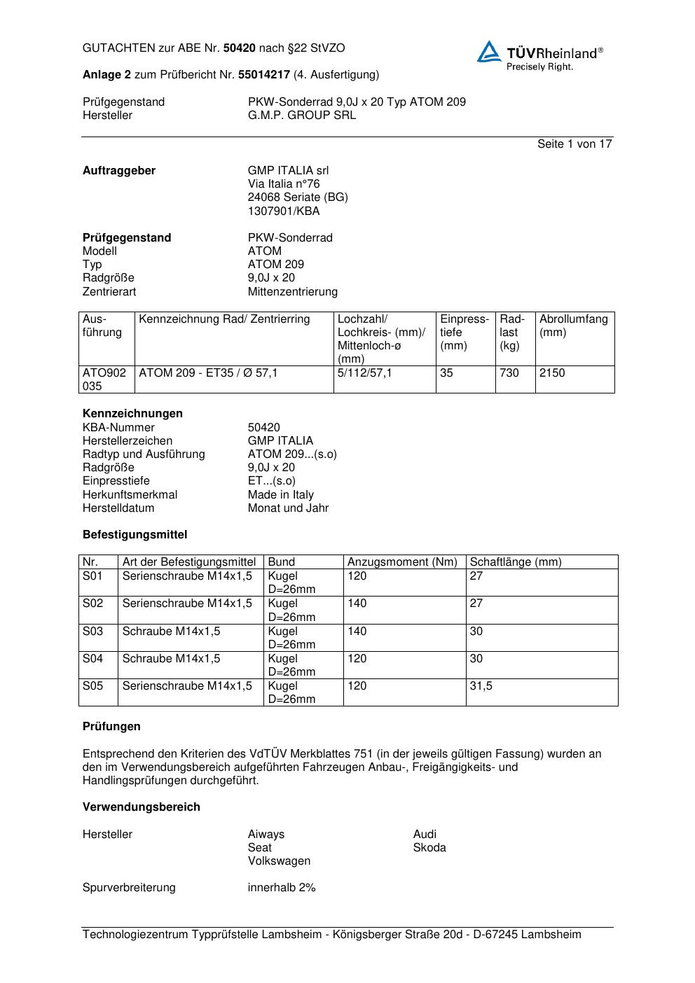 Dieses Gutachten (abe) bezieht sich auf die Alufelge G.M.P. GROUP SRL (GMP Italia srl) ATOM 209 in der Ausführung ET 0, Mittenloch 0 mm (KBA 50420). Im PDF findest du typischerweise zulässige Reifengrößen, Auflagen/Anbauhinweise und – je nach Dokument – Hinweise zur Eintragung.
