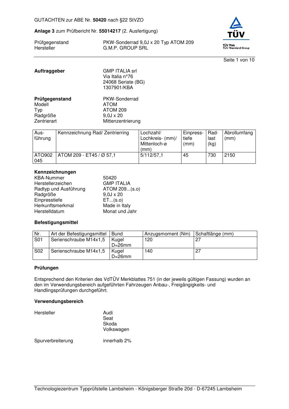 Dieses Gutachten (abe) bezieht sich auf die Alufelge G.M.P. GROUP SRL (GMP Italia srl) ATOM 209 in der Ausführung ET 0, Mittenloch 0 mm (KBA 50420). Im PDF findest du typischerweise zulässige Reifengrößen, Auflagen/Anbauhinweise und – je nach Dokument – Hinweise zur Eintragung.