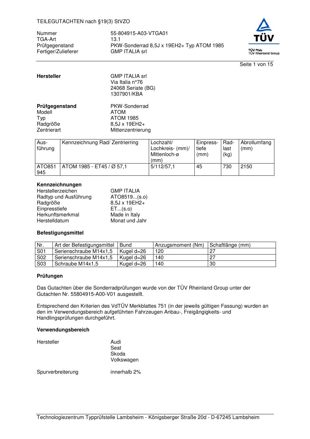 teilegutachten 55-804915-a03-vtga01 GMP ITALIA srl ATOM 1985