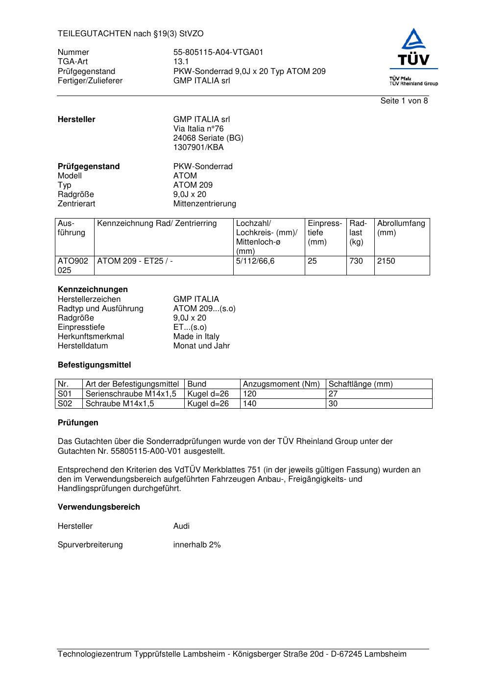 teilegutachten 55-805115-a04-vtga01 GMP ITALIA srl ATOM 209