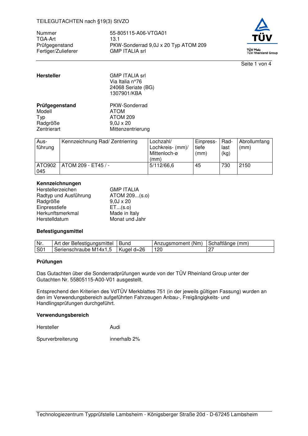 teilegutachten 55805115-a00-v01 GMP ITALIA srl ATOM 209