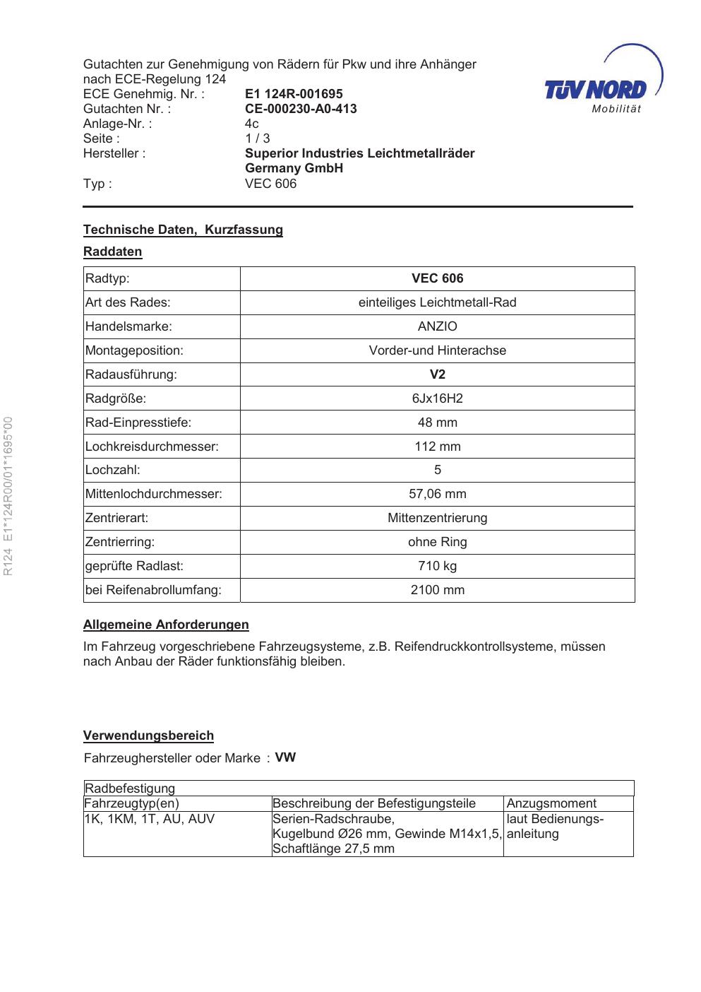 ece e1-124r00-01-1695-00 Superior Industries Leichtmetallräder Germany GmbH VEC 606
