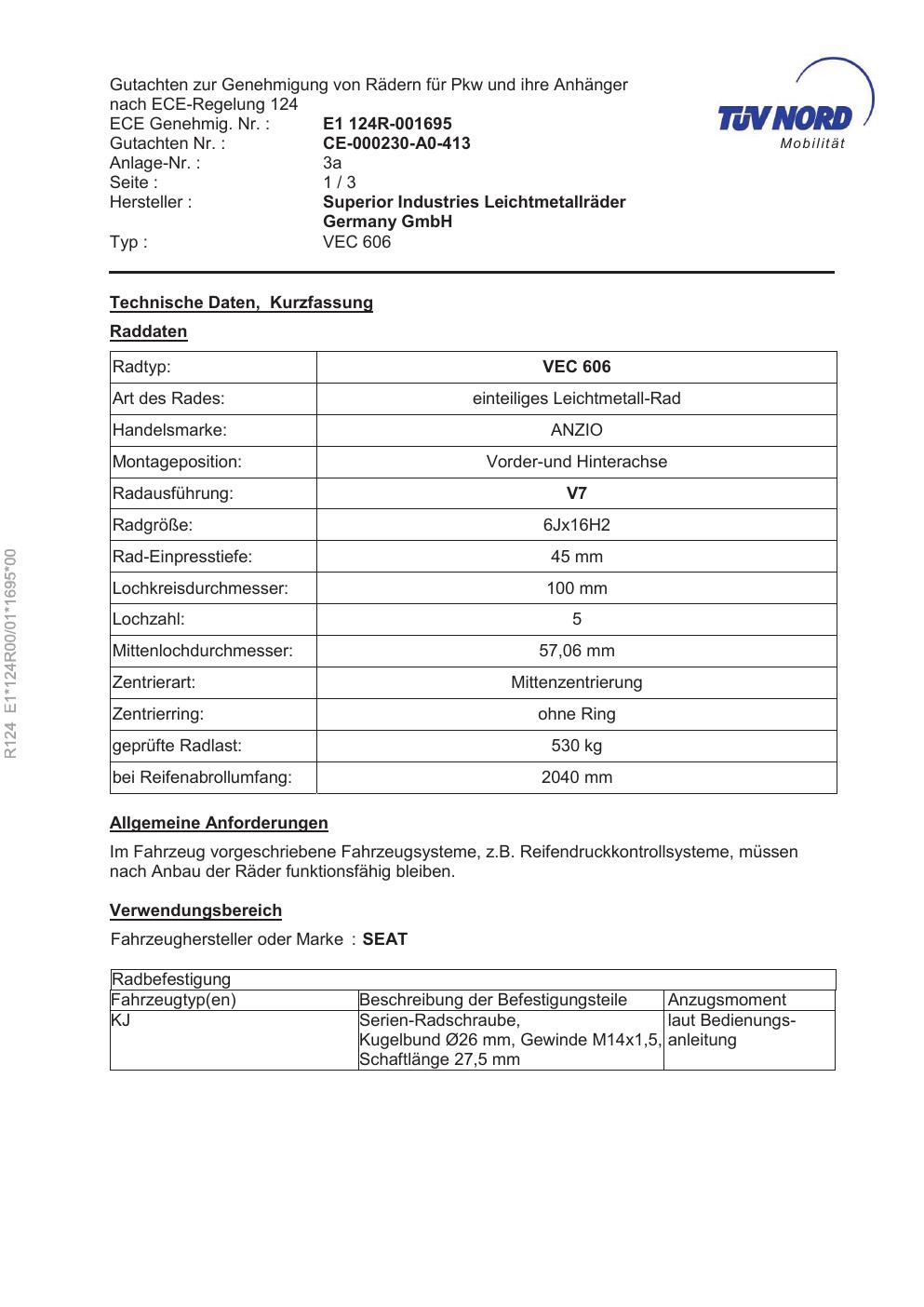 ece e1-124r00-01-1695-00 Superior Industries Leichtmetallräder Germany GmbH VEC 606