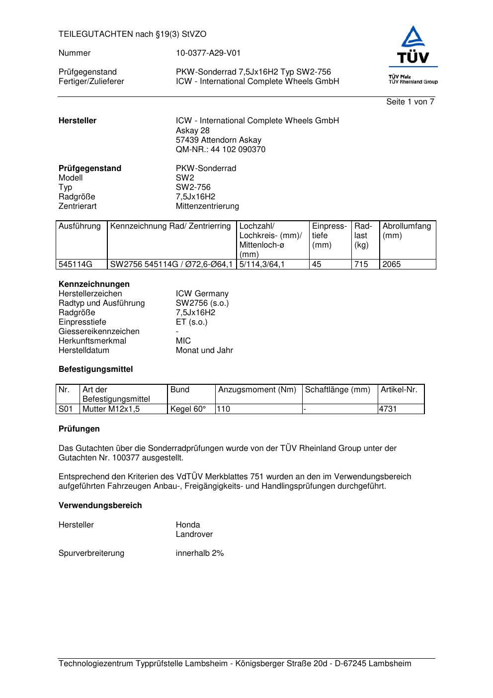 teilegutachten 10-0377-a29-v01 ICW SW2-756
