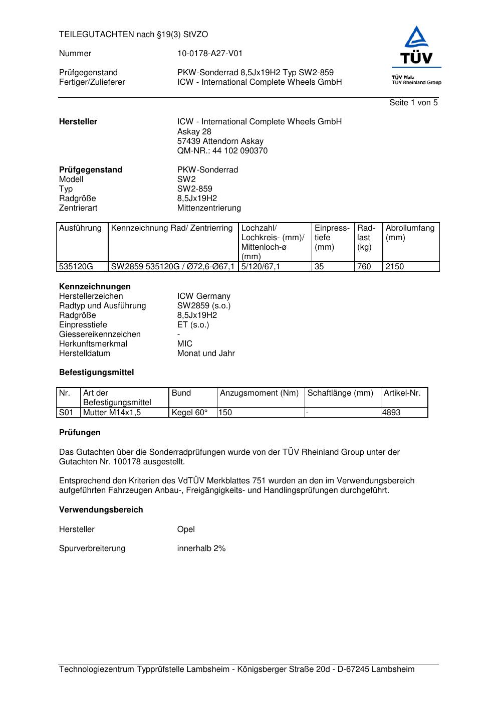 Felgengutachten / teilegutachten für Alufelgen ICW SW2-859 (ET 0, Mittenloch 0 mm) (Zertifikatsnummer 100178). Hier kostenlos als PDF herunterladen. Der Download-Link ist 24 Stunden gültig und kann bis zu zwei Mal verwendet werden.