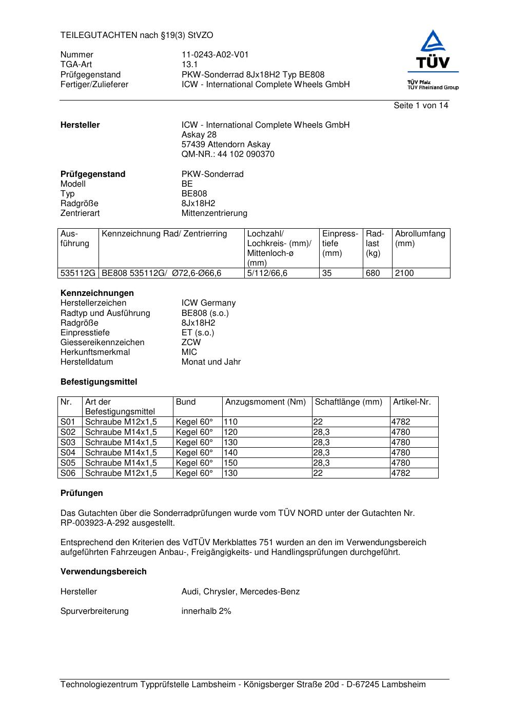 teilegutachten rp-003923-a-292 ICW - International Complete Wheels GmbH BE808