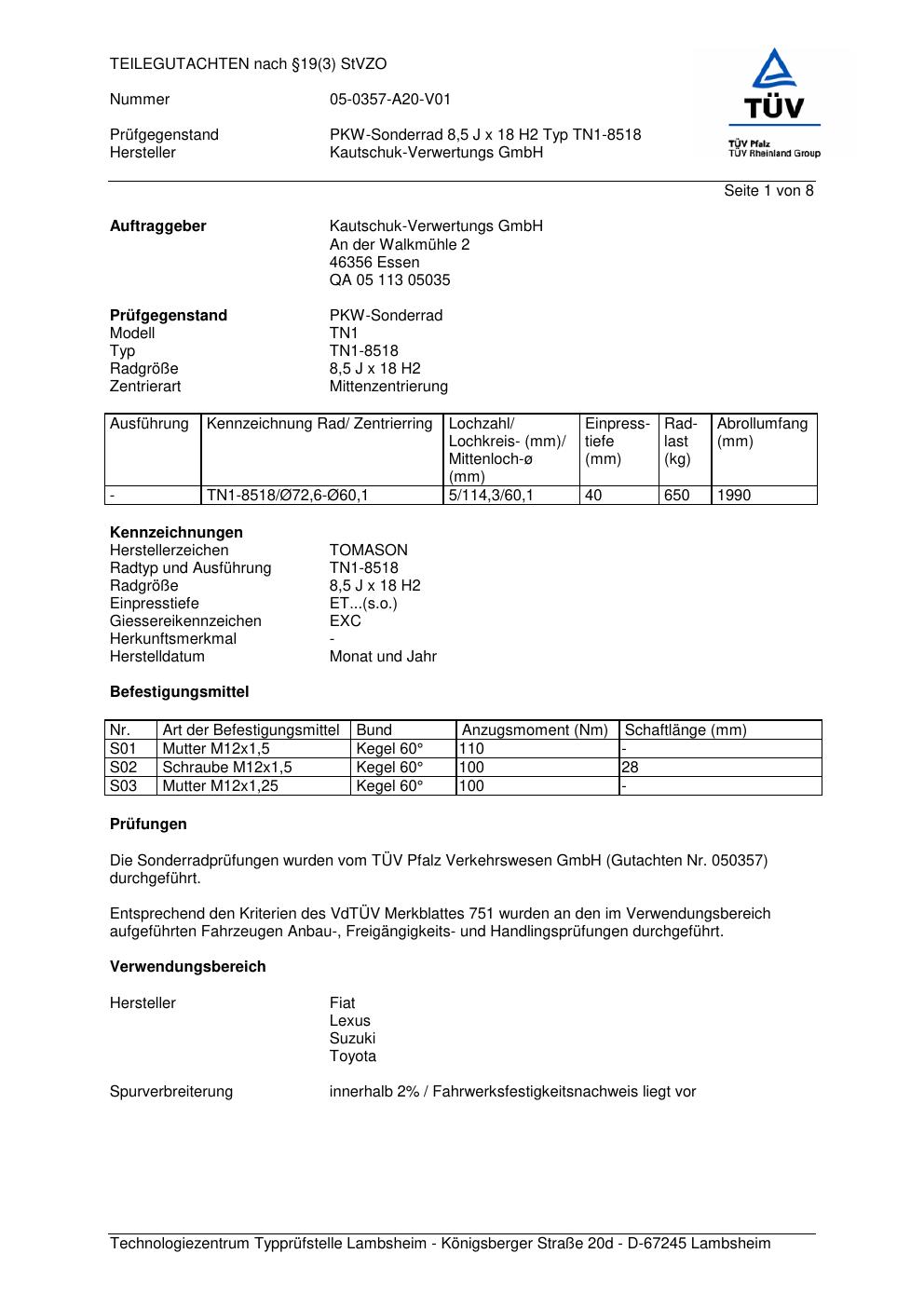 teilegutachten 05-0357-a20-v01 TOMASON TN1-8518