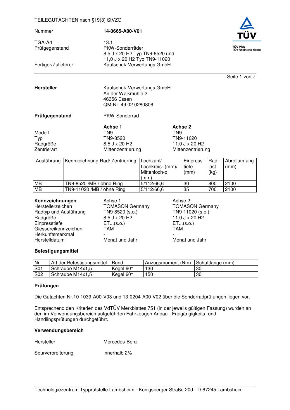 teilegutachten 14-0665-a00-v01 Kautschuk-Verwertungs GmbH (Herstellerzeichen: TOMASON GERMANY) TN9-8520 und TN9-11020