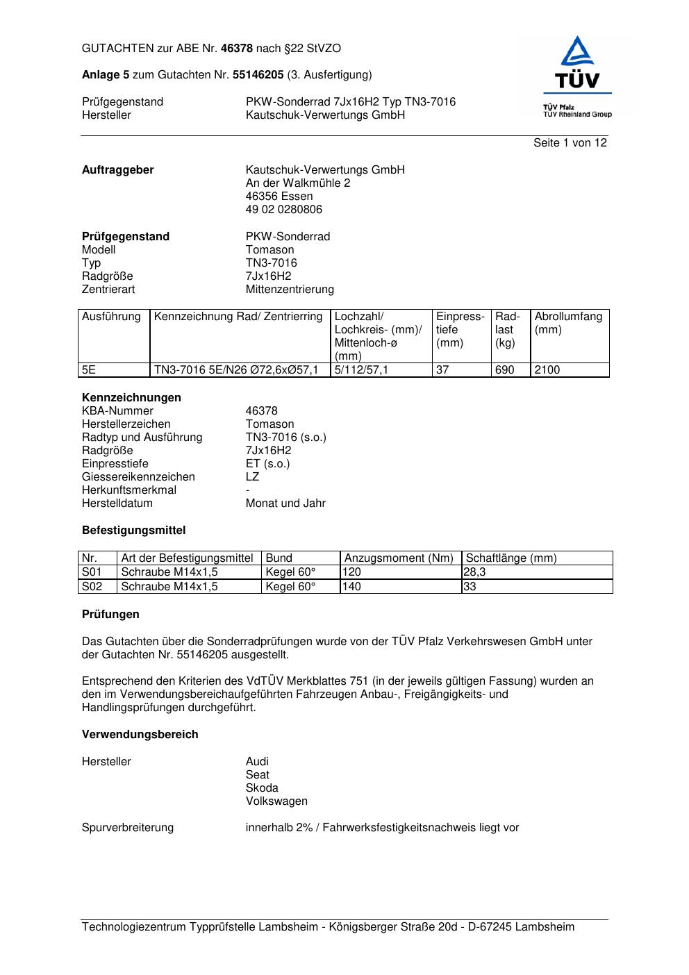 Felgengutachten / abe für Alufelgen TOMASON TN3-7016 (ET 0, Mittenloch 0 mm) mit KBA 46378 (Zertifikatsnummer 46378). Hier kostenlos als PDF herunterladen. Der Download-Link ist 24 Stunden gültig und kann bis zu zwei Mal verwendet werden.