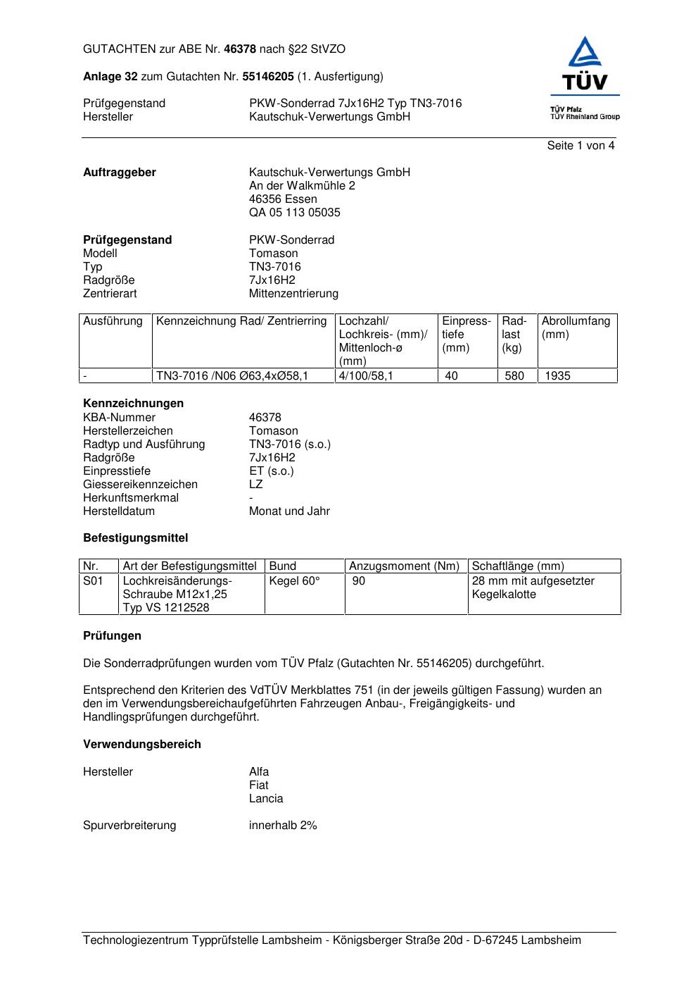 Felgengutachten / abe für Alufelgen Kautschuk-Verwertungs GmbH (Tomason) TN3-7016 (ET 0, Mittenloch 0 mm) mit KBA 46378 (Zertifikatsnummer 46378). Hier kostenlos als PDF herunterladen. Der Download-Link ist 24 Stunden gültig und kann bis zu zwei Mal verwendet werden.