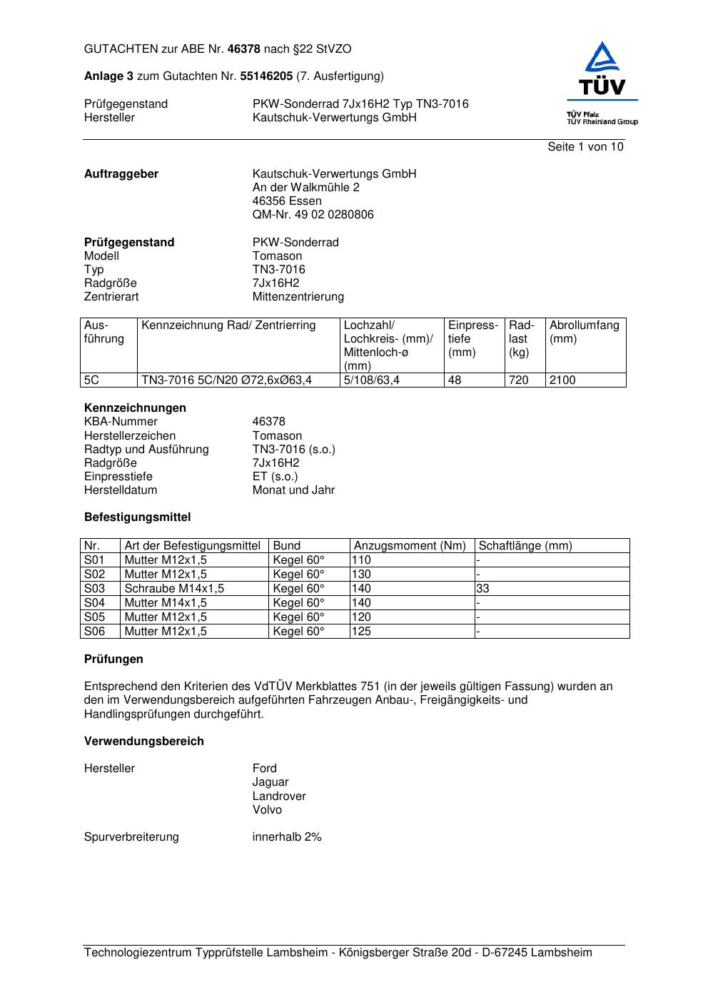Dieses Gutachten (abe) bezieht sich auf die Alufelge TOMASON TN3-7016 in der Ausführung ET 0, Mittenloch 0 mm (KBA 46378). Im PDF findest du typischerweise zulässige Reifengrößen, Auflagen/Anbauhinweise und – je nach Dokument – Hinweise zur Eintragung.