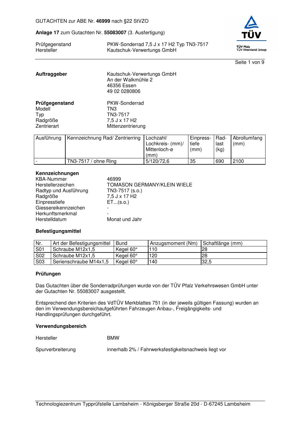 • Stimmt die KBA-Nummer auf der Felge mit diesem Dokument überein?