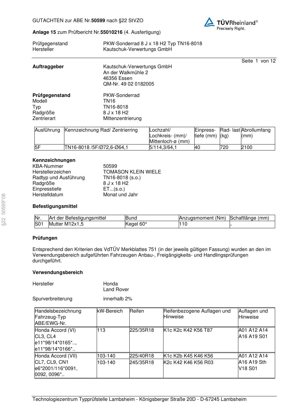 • Stimmt die KBA-Nummer auf der Felge mit diesem Dokument überein?