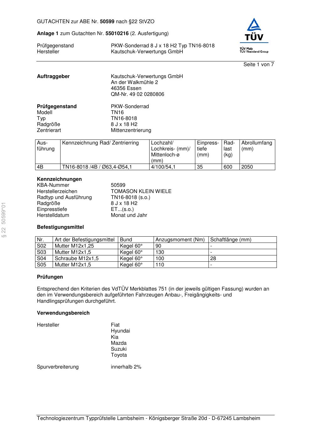 Dieses Gutachten (abe) bezieht sich auf die Alufelge Kautschuk-Verwertungs GmbH TN16-8018 in der Ausführung ET 0, Mittenloch 0 mm (KBA 50599). Im PDF findest du typischerweise zulässige Reifengrößen, Auflagen/Anbauhinweise und – je nach Dokument – Hinweise zur Eintragung.