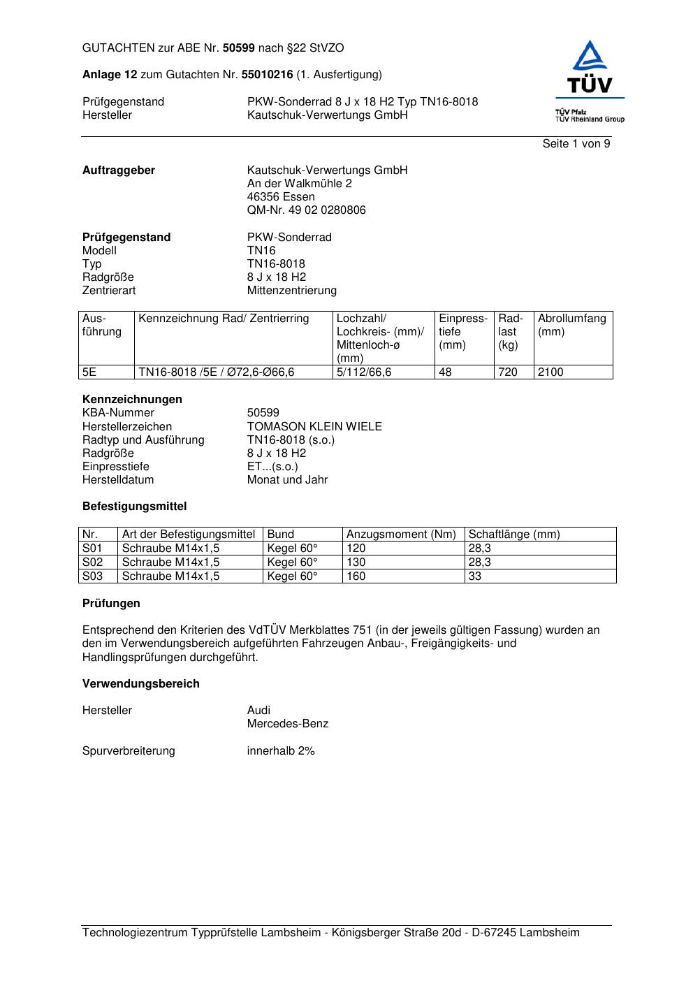 Dieses Gutachten (abe) bezieht sich auf die Alufelge Kautschuk-Verwertungs GmbH TN16-8 018 in der Ausführung ET 0, Mittenloch 0 mm (KBA 50599). Im PDF findest du typischerweise zulässige Reifengrößen, Auflagen/Anbauhinweise und – je nach Dokument – Hinweise zur Eintragung.