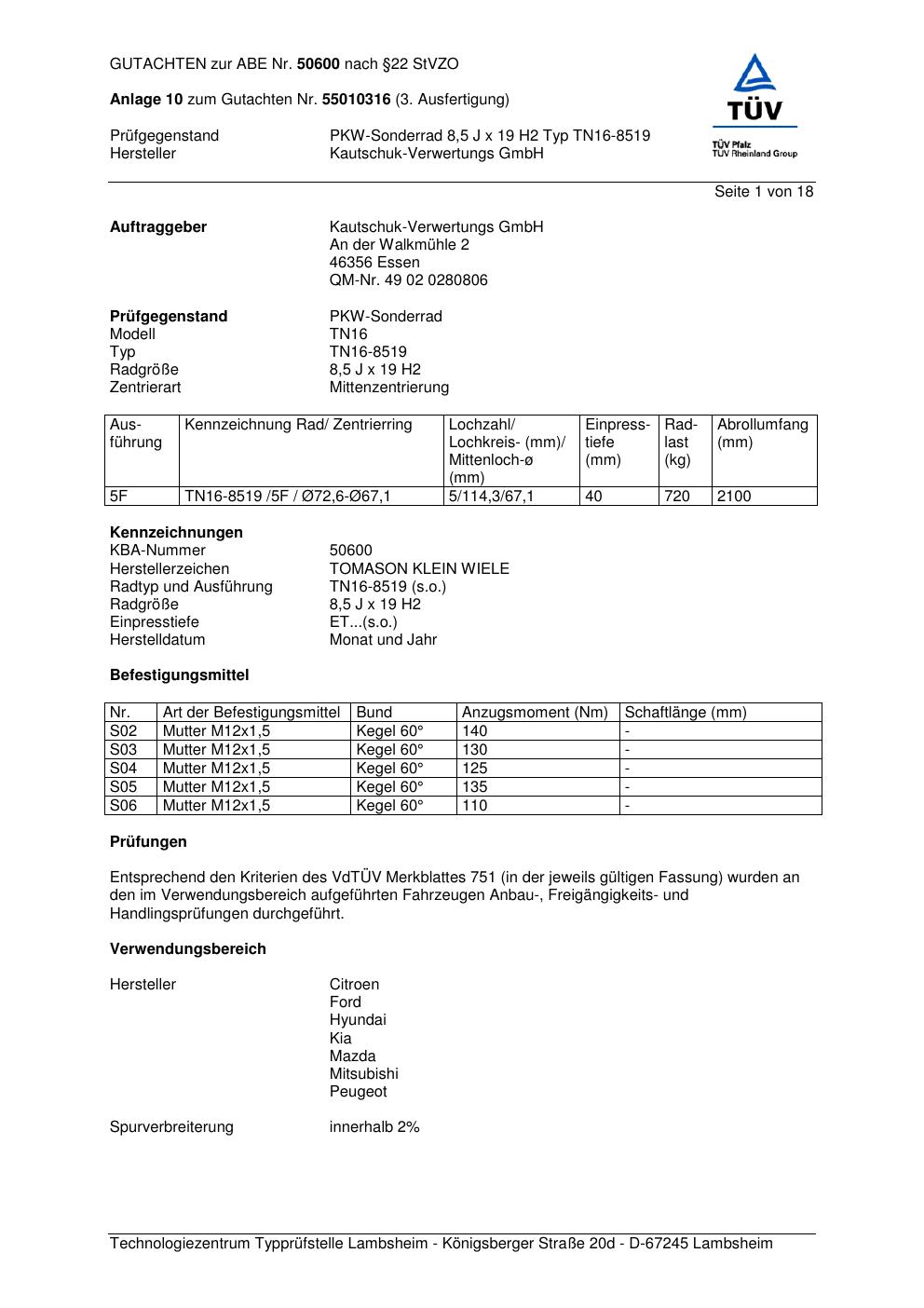 Dieses Gutachten (abe) bezieht sich auf die Alufelge Kautschuk-Verwertungs GmbH TN16 -8519 in der Ausführung ET 0, Mittenloch 0 mm (KBA 50600). Im PDF findest du typischerweise zulässige Reifengrößen, Auflagen/Anbauhinweise und – je nach Dokument – Hinweise zur Eintragung.