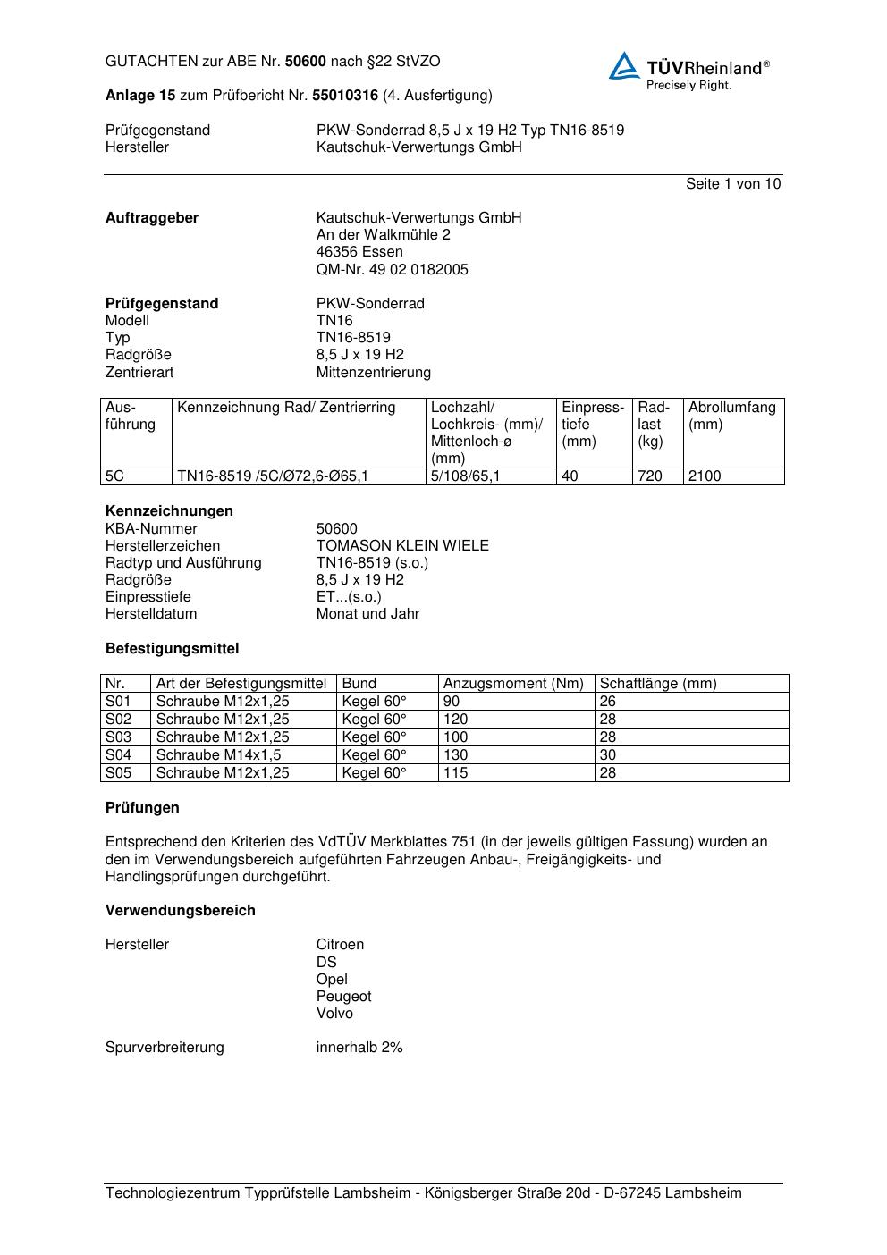 Felgengutachten / abe für Alufelgen Kautschuk-Verwertungs GmbH TN16-8519 (ET 0, Mittenloch 0 mm) mit KBA 50600 (Zertifikatsnummer 50600). Hier kostenlos als PDF herunterladen. Der Download-Link ist 24 Stunden gültig und kann bis zu zwei Mal verwendet werden.