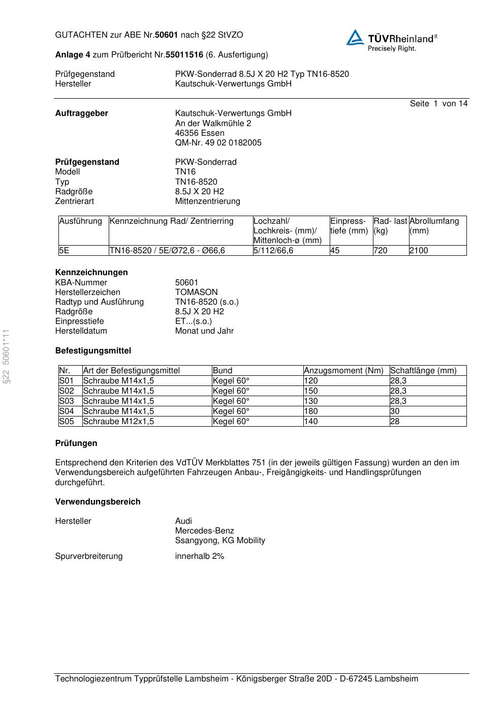 Dieses Gutachten (abe) bezieht sich auf die Alufelge TOMASON TN16-8520 in der Ausführung ET 0, Mittenloch 0 mm (KBA 50601). Im PDF findest du typischerweise zulässige Reifengrößen, Auflagen/Anbauhinweise und – je nach Dokument – Hinweise zur Eintragung.