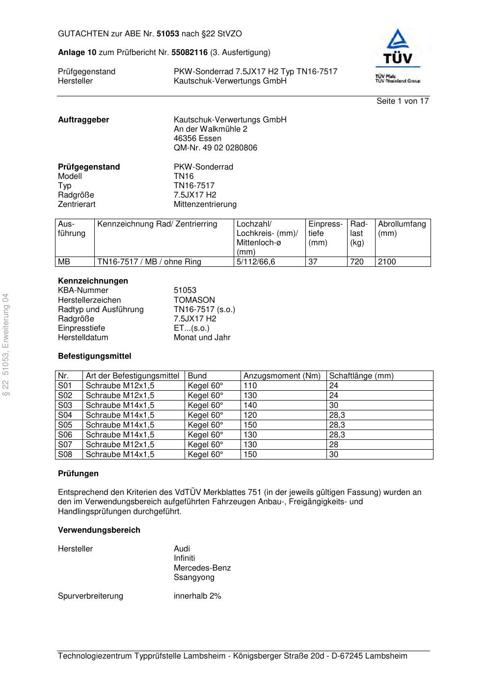 Dieses Gutachten (abe) bezieht sich auf die Alufelge TOMASON TN16-7517 in der Ausführung ET 0, Mittenloch 0 mm (KBA 51053). Im PDF findest du typischerweise zulässige Reifengrößen, Auflagen/Anbauhinweise und – je nach Dokument – Hinweise zur Eintragung.