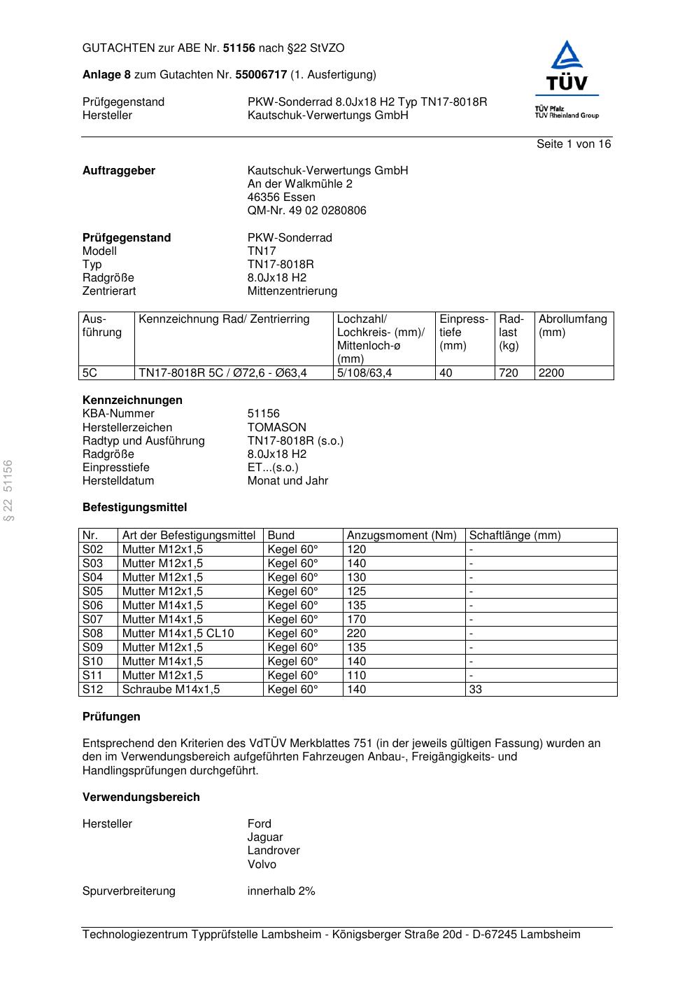 Felgengutachten / abe für Alufelgen TOMASON TN17-80 18R (ET 0, Mittenloch 0 mm) mit KBA 51156 (Zertifikatsnummer 51156). Hier kostenlos als PDF herunterladen. Der Download-Link ist 24 Stunden gültig und kann bis zu zwei Mal verwendet werden.