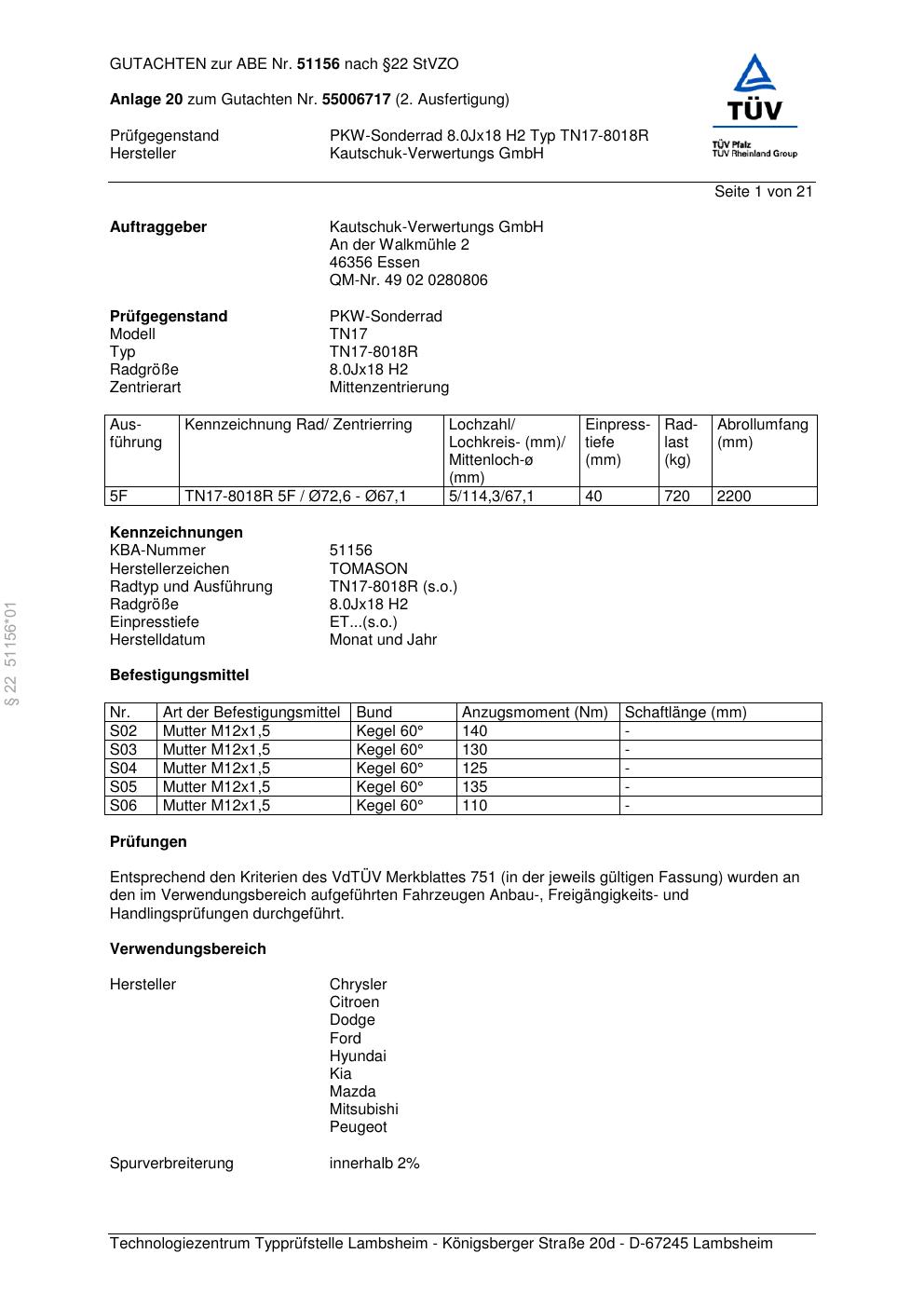 Dieses Gutachten (abe) bezieht sich auf die Alufelge TOMASON TN17-8018R in der Ausführung ET 0, Mittenloch 0 mm (KBA 51156). Im PDF findest du typischerweise zulässige Reifengrößen, Auflagen/Anbauhinweise und – je nach Dokument – Hinweise zur Eintragung.