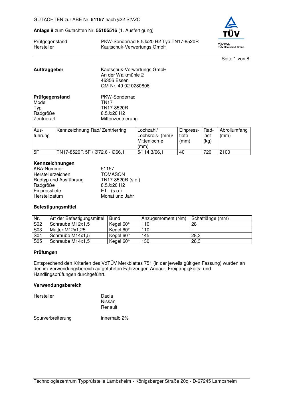 Dieses Gutachten (abe) bezieht sich auf die Alufelge Kautschuk-Verwertungs GmbH TN17-8520R in der Ausführung ET 0, Mittenloch 0 mm (KBA 51157). Im PDF findest du typischerweise zulässige Reifengrößen, Auflagen/Anbauhinweise und – je nach Dokument – Hinweise zur Eintragung.