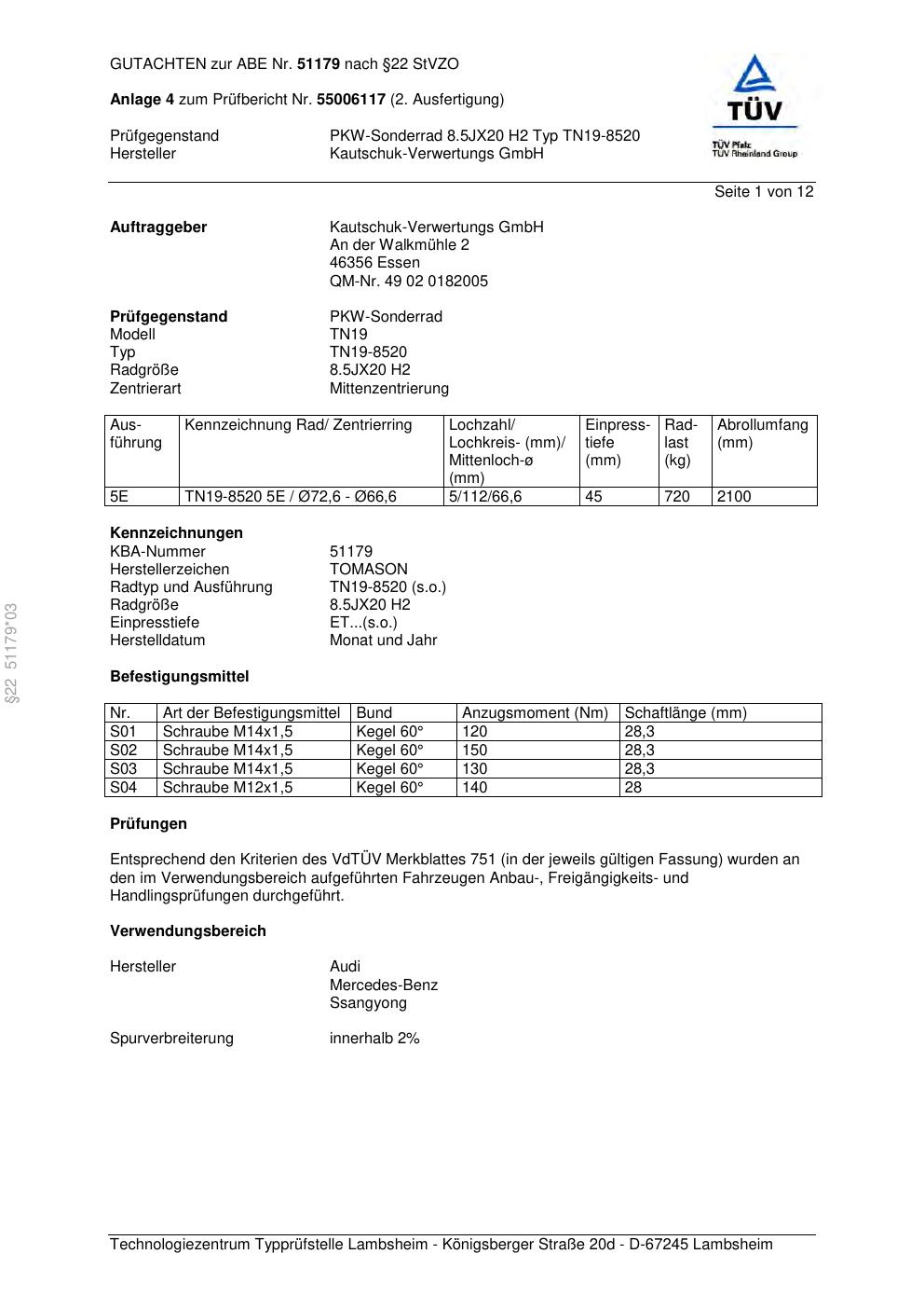 Dieses Gutachten (abe) bezieht sich auf die Alufelge TOMASON TN19-8520 in der Ausführung ET 0, Mittenloch 0 mm (KBA 51179). Im PDF findest du typischerweise zulässige Reifengrößen, Auflagen/Anbauhinweise und – je nach Dokument – Hinweise zur Eintragung.