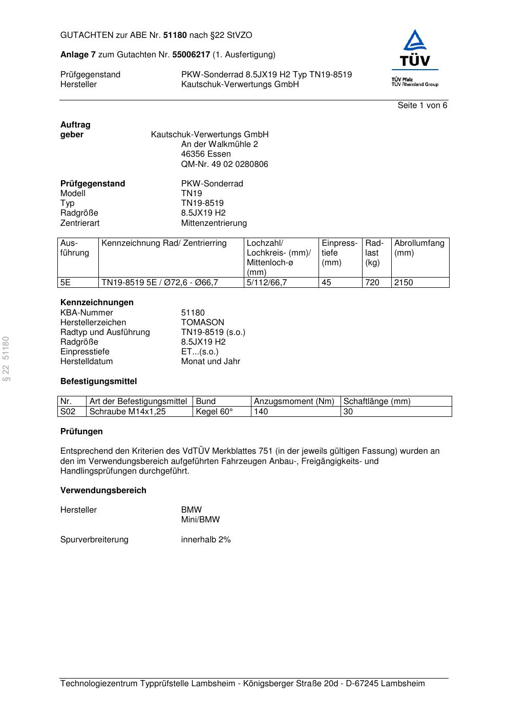 - Tomason (Hersteller: Kautschuk-Verwertungs GmbH) TN19-8519 – 0.0Jx0 ET0.0 (KBA 51180)