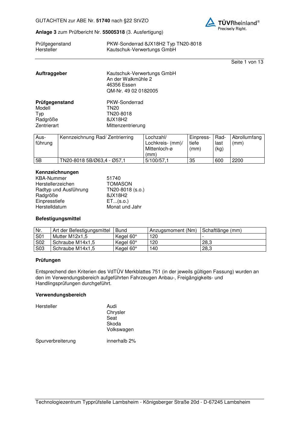 Dieses Gutachten (abe) bezieht sich auf die Alufelge TOMASON TN20-8018 in der Ausführung ET 0, Mittenloch 0 mm (KBA 51740). Im PDF findest du typischerweise zulässige Reifengrößen, Auflagen/Anbauhinweise und – je nach Dokument – Hinweise zur Eintragung.