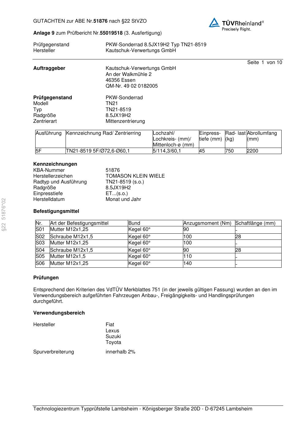 Dieses Gutachten (abe) bezieht sich auf die Alufelge Kautschuk-Verwertungs GmbH TN21-8519 in der Ausführung ET 0, Mittenloch 0 mm (KBA 51876). Im PDF findest du typischerweise zulässige Reifengrößen, Auflagen/Anbauhinweise und – je nach Dokument – Hinweise zur Eintragung.