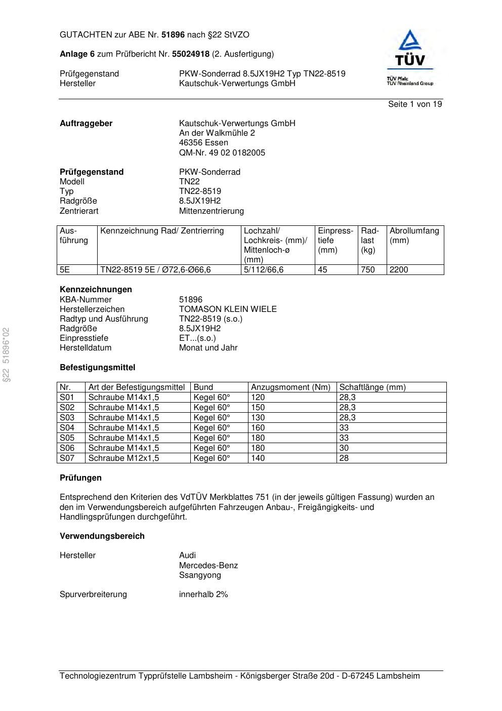 Dieses Gutachten (abe) bezieht sich auf die Alufelge Kautschuk-Verwertungs GmbH TN22-8519 in der Ausführung ET 0, Mittenloch 0 mm (KBA 51896). Im PDF findest du typischerweise zulässige Reifengrößen, Auflagen/Anbauhinweise und – je nach Dokument – Hinweise zur Eintragung.