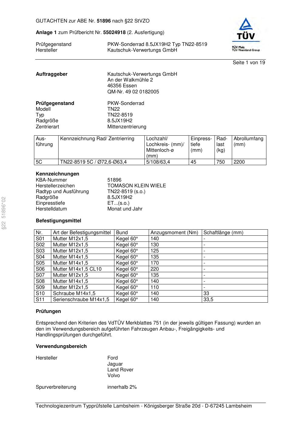 Dieses Gutachten (abe) bezieht sich auf die Alufelge Kautschuk-Verwertungs GmbH TN22-8519 in der Ausführung ET 0, Mittenloch 0 mm (KBA 51896). Im PDF findest du typischerweise zulässige Reifengrößen, Auflagen/Anbauhinweise und – je nach Dokument – Hinweise zur Eintragung.