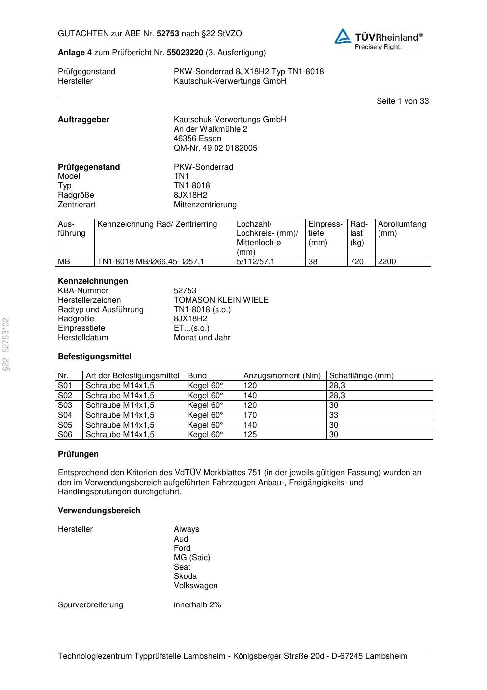 Dieses Gutachten (abe) bezieht sich auf die Alufelge TOMASON TN1-8018 in der Ausführung ET 0, Mittenloch 0 mm (KBA 52753). Im PDF findest du typischerweise zulässige Reifengrößen, Auflagen/Anbauhinweise und – je nach Dokument – Hinweise zur Eintragung.