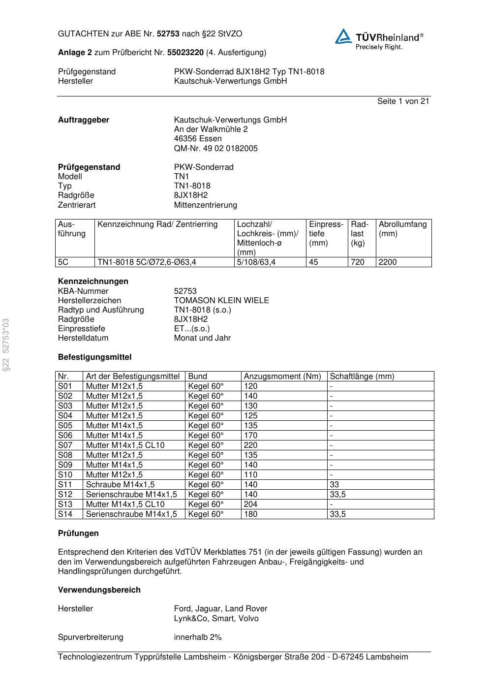 Dieses Gutachten (abe) bezieht sich auf die Alufelge TOMASON TN1-8018 in der Ausführung ET 0, Mittenloch 0 mm (KBA 52753). Im PDF findest du typischerweise zulässige Reifengrößen, Auflagen/Anbauhinweise und – je nach Dokument – Hinweise zur Eintragung.