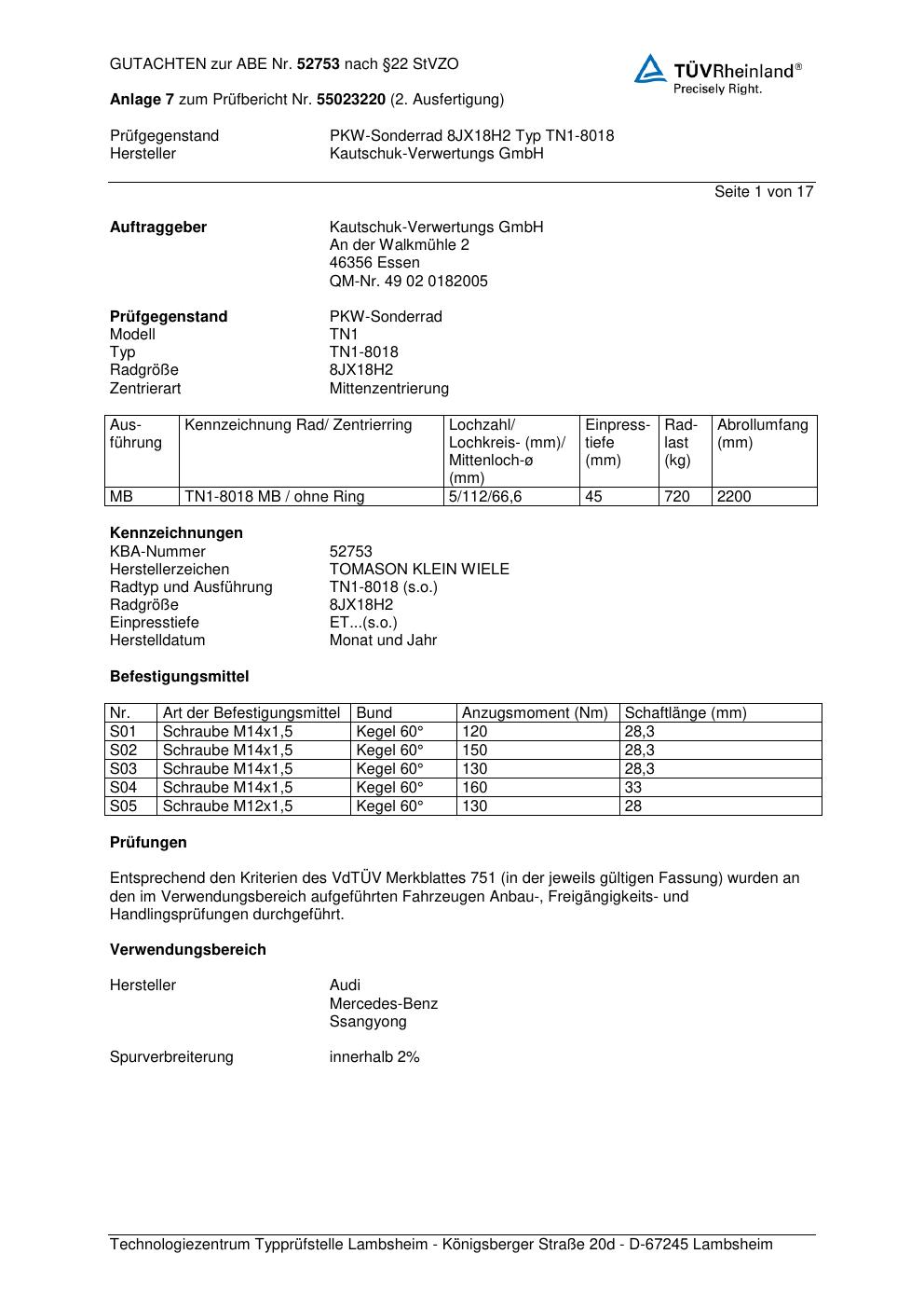 Dieses Gutachten (abe) bezieht sich auf die Alufelge TOMASON TN1-8018 in der Ausführung ET 0, Mittenloch 0 mm (KBA 52753). Im PDF findest du typischerweise zulässige Reifengrößen, Auflagen/Anbauhinweise und – je nach Dokument – Hinweise zur Eintragung.