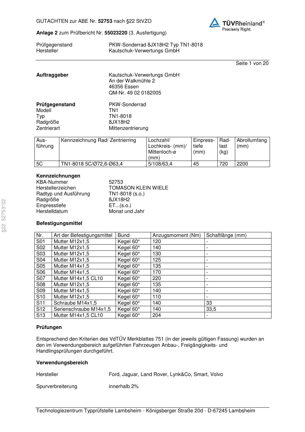 Dieses Gutachten (abe) bezieht sich auf die Alufelge TOMASON TN1-8018 in der Ausführung ET 0, Mittenloch 0 mm (KBA 52753). Im PDF findest du typischerweise zulässige Reifengrößen, Auflagen/Anbauhinweise und – je nach Dokument – Hinweise zur Eintragung.