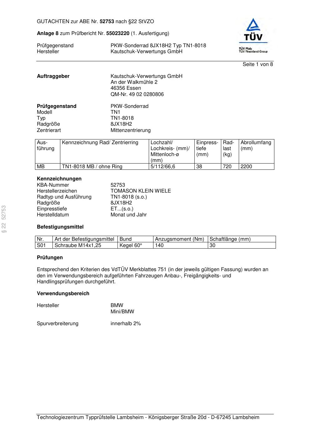 Dieses Gutachten (abe) bezieht sich auf die Alufelge TOMASON TN1-8018 in der Ausführung ET 0, Mittenloch 0 mm (KBA 52753). Im PDF findest du typischerweise zulässige Reifengrößen, Auflagen/Anbauhinweise und – je nach Dokument – Hinweise zur Eintragung.