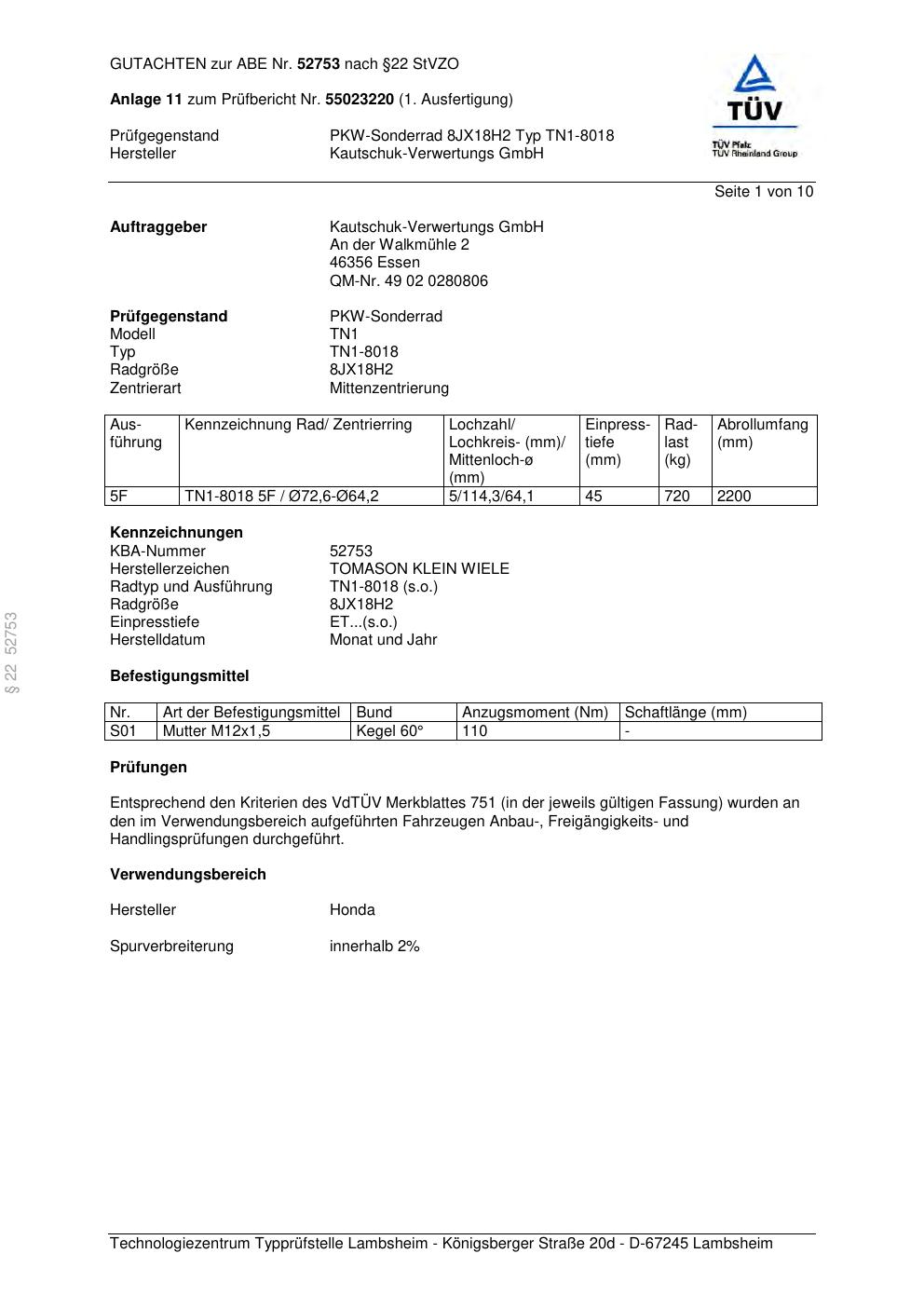 Dieses Gutachten (abe) bezieht sich auf die Alufelge TOMASON TN1-8018 in der Ausführung ET 0, Mittenloch 0 mm (KBA 52753). Im PDF findest du typischerweise zulässige Reifengrößen, Auflagen/Anbauhinweise und – je nach Dokument – Hinweise zur Eintragung.