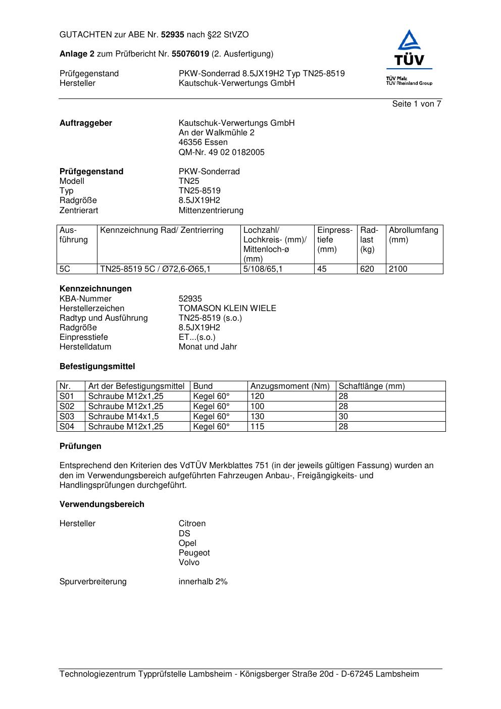 Dieses Gutachten (abe) bezieht sich auf die Alufelge TOMASON TN25-8519 in der Ausführung ET 0, Mittenloch 0 mm (KBA 52935). Im PDF findest du typischerweise zulässige Reifengrößen, Auflagen/Anbauhinweise und – je nach Dokument – Hinweise zur Eintragung.