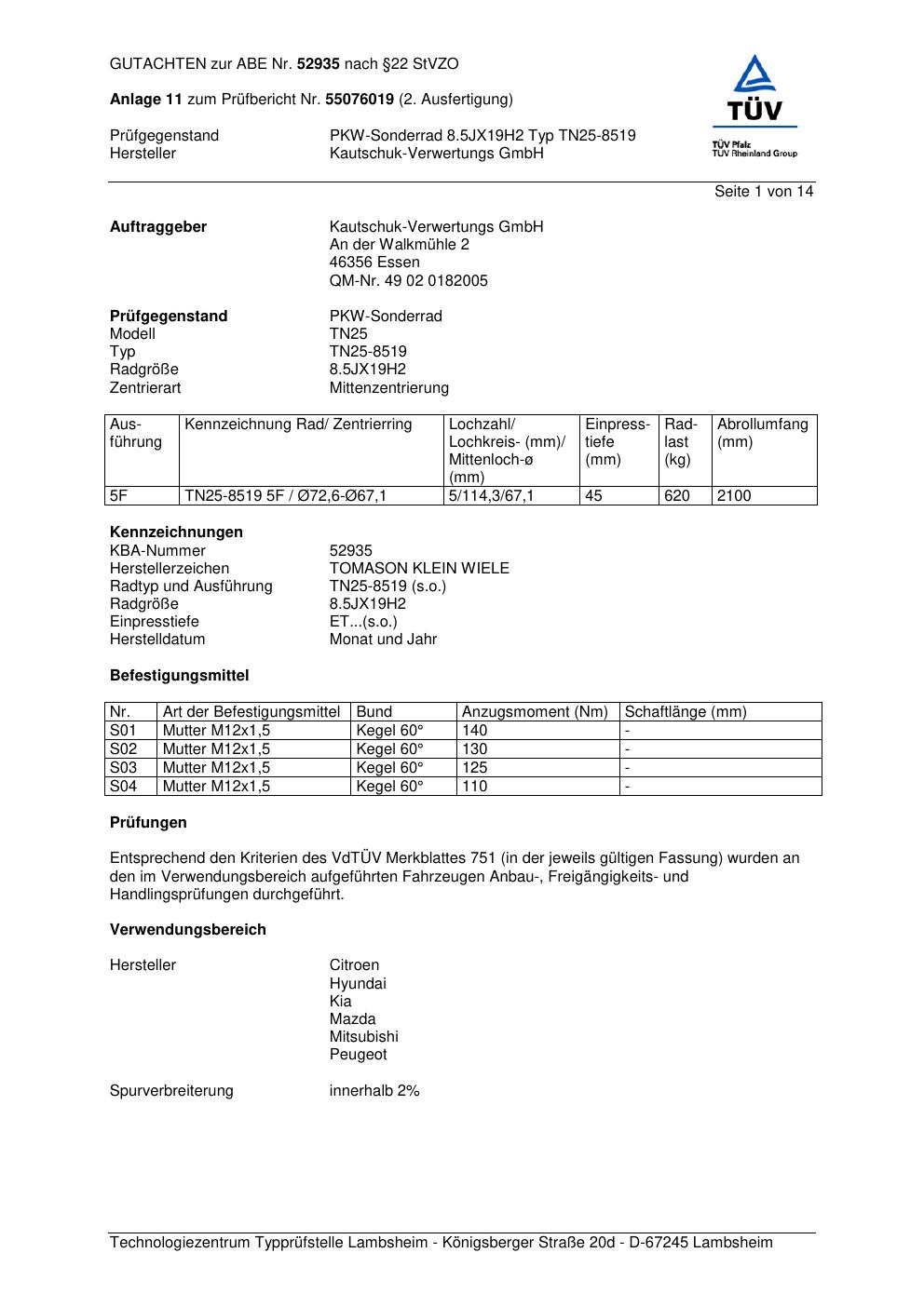 Dieses Gutachten (abe) bezieht sich auf die Alufelge TOMASON TN25-851 9 in der Ausführung ET 0, Mittenloch 0 mm (KBA 52935). Im PDF findest du typischerweise zulässige Reifengrößen, Auflagen/Anbauhinweise und – je nach Dokument – Hinweise zur Eintragung.