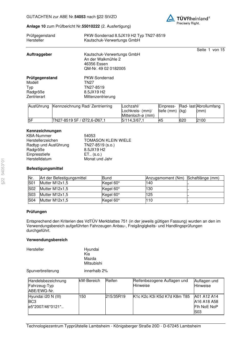 Dieses Gutachten (abe) bezieht sich auf die Alufelge Kautschuk-Verwertungs GmbH TN27-85 19 in der Ausführung ET 0, Mittenloch 0 mm (KBA 54053). Im PDF findest du typischerweise zulässige Reifengrößen, Auflagen/Anbauhinweise und – je nach Dokument – Hinweise zur Eintragung.