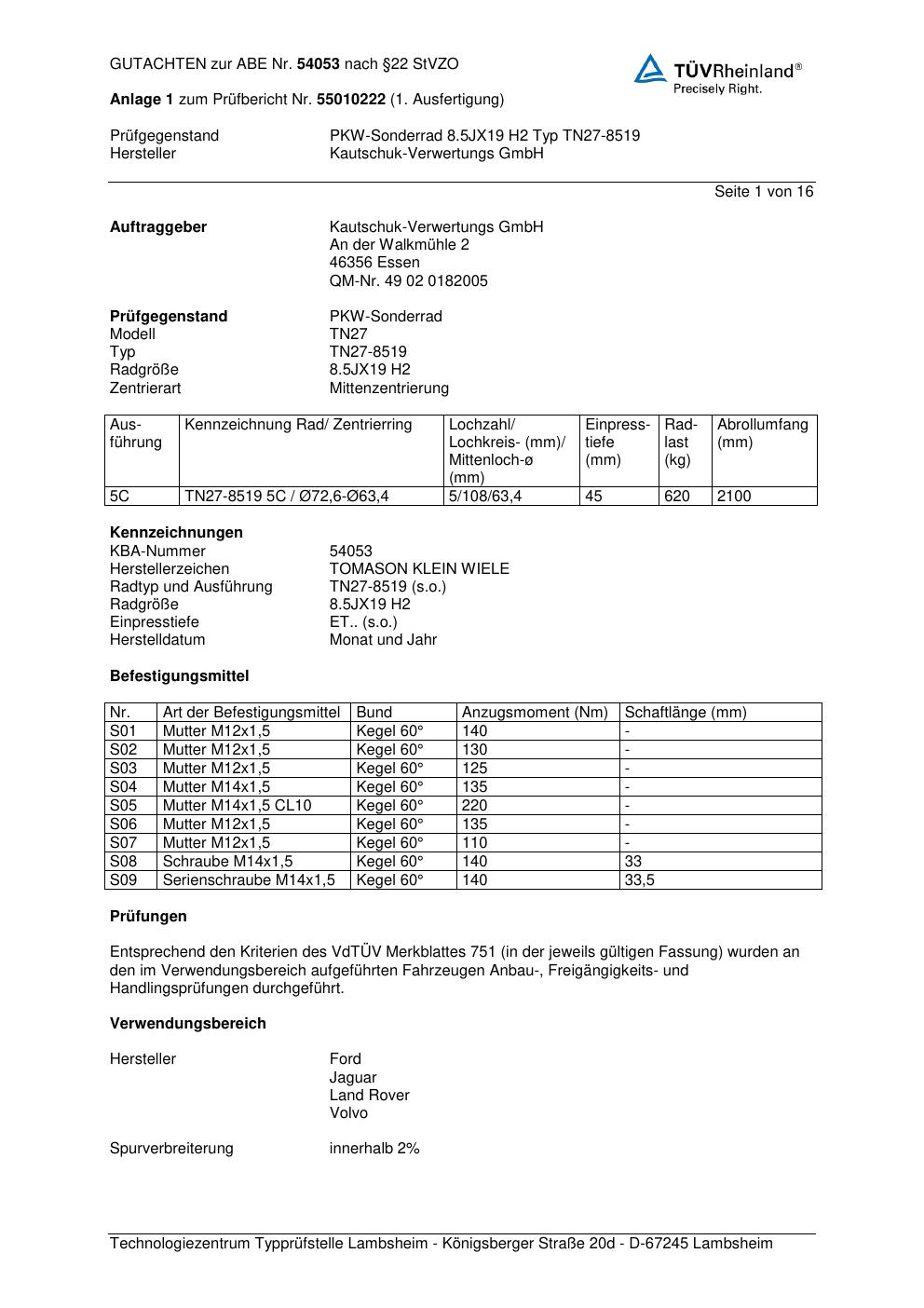 Felgengutachten / abe für Alufelgen Kautschuk-Verwertungs GmbH TN27-85 19 (ET 0, Mittenloch 0 mm) mit KBA 54053 (Zertifikatsnummer 54053). Hier kostenlos als PDF herunterladen. Der Download-Link ist 24 Stunden gültig und kann bis zu zwei Mal verwendet werden.
