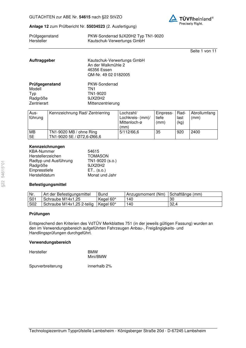 - Kautschuk-Verwertungs GmbH (Herstellerzeichen TOMASON) TN1-9020 – 0.0Jx0 ET0.0 (KBA 54615)