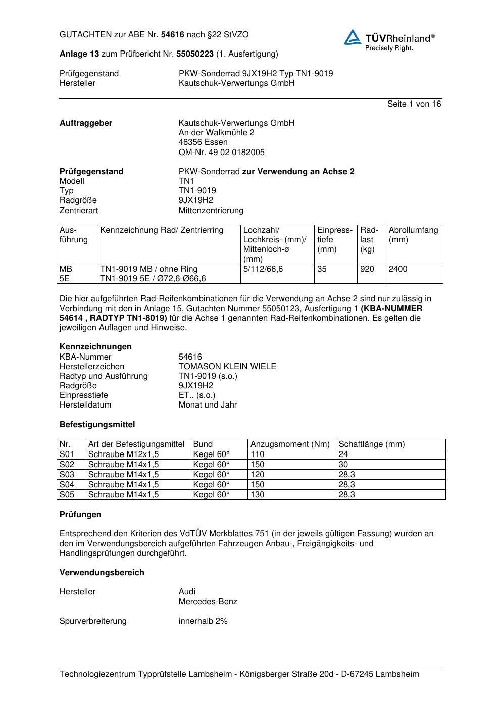 Dieses Gutachten (abe) bezieht sich auf die Alufelge Kautschuk-Verwertungs GmbH (Herstellerzeichen: TOMASON KLEIN WIELE) TN1-9019 in der Ausführung ET 0, Mittenloch 0 mm (KBA 54616). Im PDF findest du typischerweise zulässige Reifengrößen, Auflagen/Anbauhinweise und – je nach Dokument – Hinweise zur Eintragung.