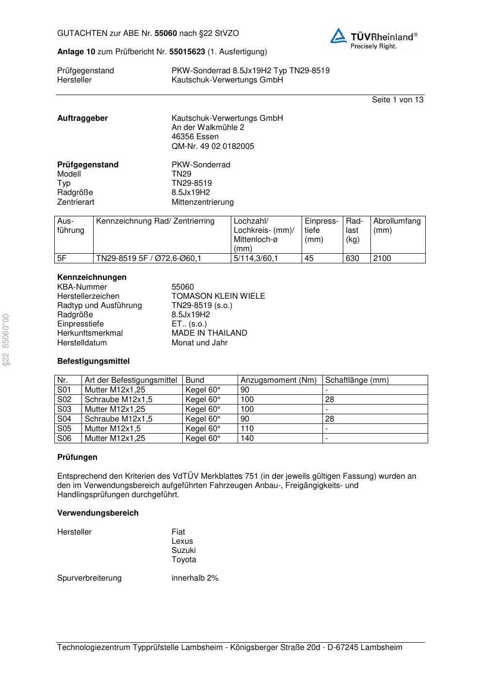 Felgengutachten / abe für Alufelgen TOMASON TN29-8519 (ET 0, Mittenloch 0 mm) mit KBA 55060 (Zertifikatsnummer 55060). Hier kostenlos als PDF herunterladen. Der Download-Link ist 24 Stunden gültig und kann bis zu zwei Mal verwendet werden.