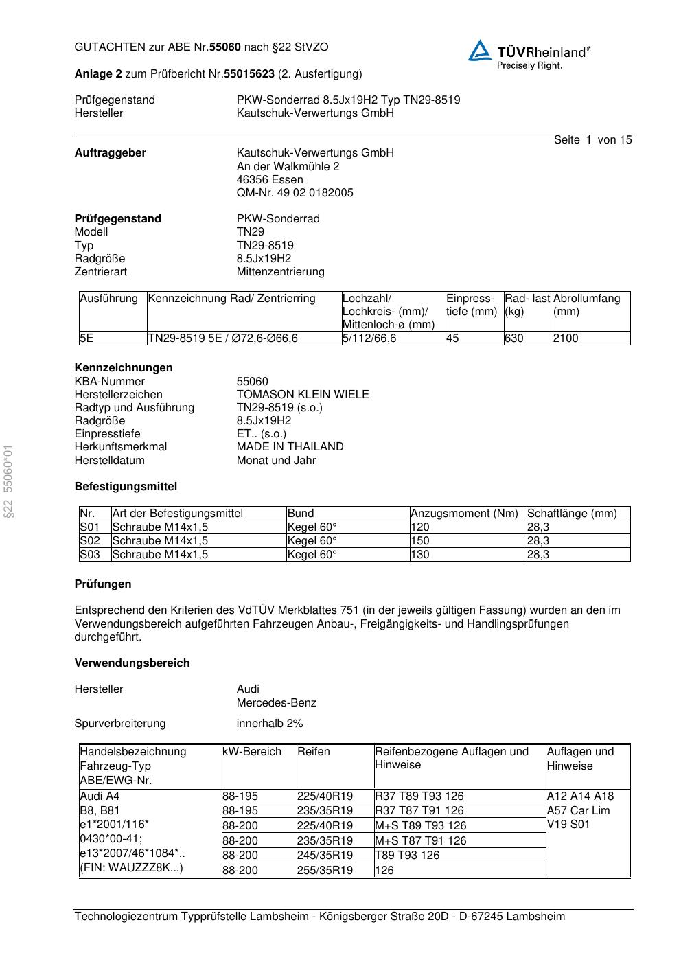 Dieses Gutachten (abe) bezieht sich auf die Alufelge Kautschuk-Verwertungs GmbH TN29-8519 in der Ausführung ET 0, Mittenloch 0 mm (KBA 55060). Im PDF findest du typischerweise zulässige Reifengrößen, Auflagen/Anbauhinweise und – je nach Dokument – Hinweise zur Eintragung.