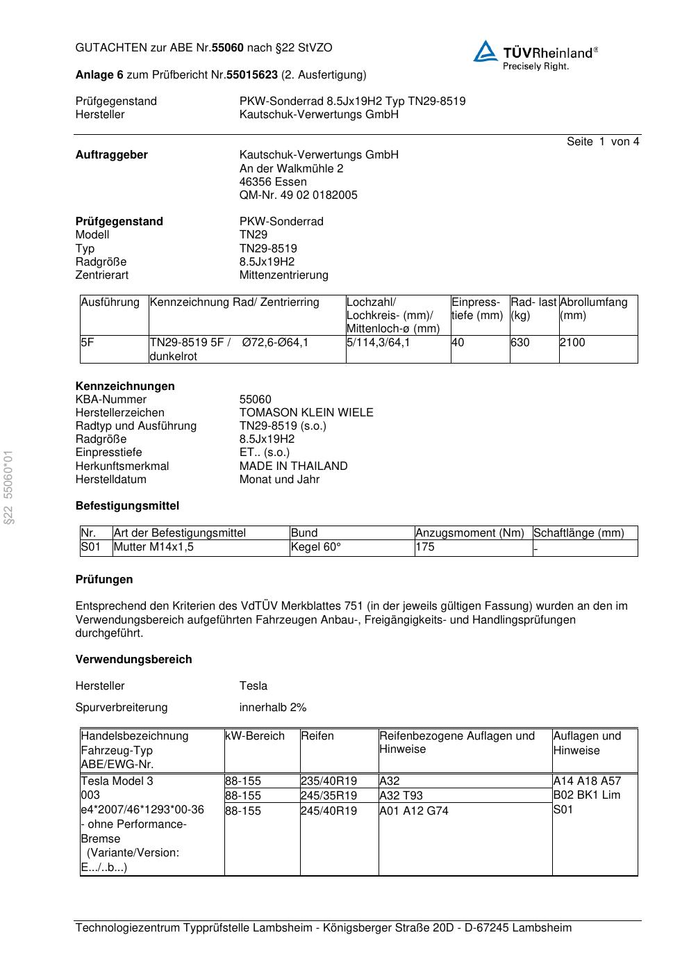 Dieses Gutachten (abe) bezieht sich auf die Alufelge TOMASON TN29-8519 in der Ausführung ET 0, Mittenloch 0 mm (KBA 55060). Im PDF findest du typischerweise zulässige Reifengrößen, Auflagen/Anbauhinweise und – je nach Dokument – Hinweise zur Eintragung.