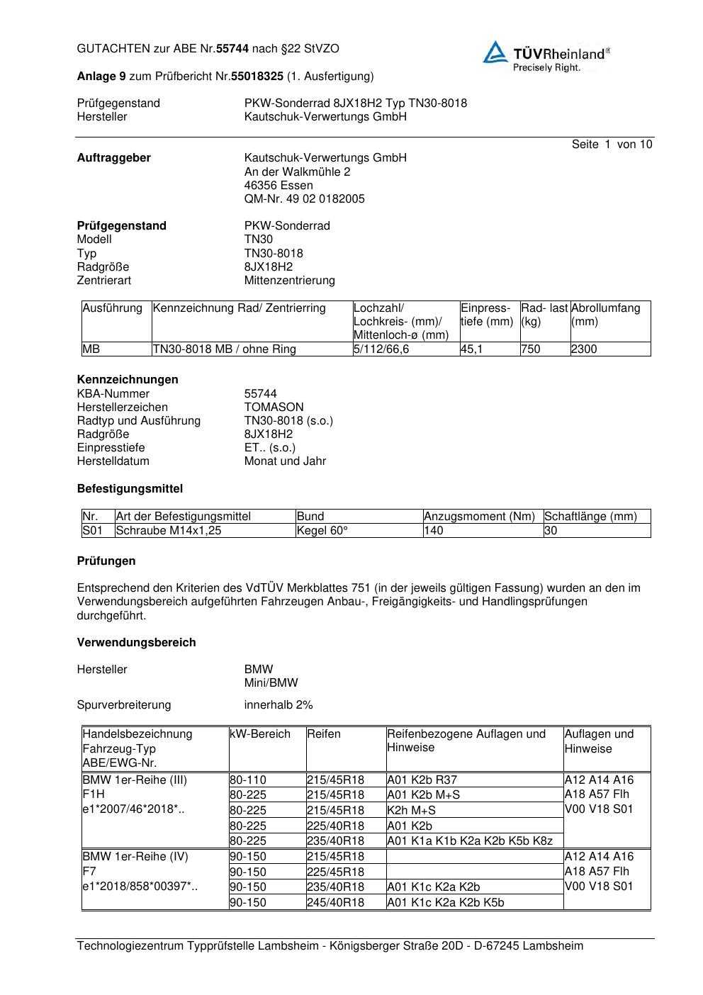 Dieses Gutachten (abe) bezieht sich auf die Alufelge Kautschuk-Verwertungs GmbH TN30-8018 in der Ausführung ET 0, Mittenloch 0 mm (KBA 55744). Im PDF findest du typischerweise zulässige Reifengrößen, Auflagen/Anbauhinweise und – je nach Dokument – Hinweise zur Eintragung.
